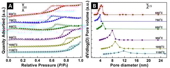 The systematic increase of the pore size with the increase of calcination temperature was further confirmed by the Barret-Joyner-Halenda (BJH) model [] according to the desorption branch and the resulting the pore size distribution curves as shown in Figure 7B. The pore size distributions in Figure 7B show that the fibers calcined at 650 °C had pores in the narrow range of 3 to 5 nm in contrast to the fibers calcined at 1150 °C, which had pores in a much broader distribution of about 8 to 16 nm. Such curves typically have hysteresis and pore size distributions may be ascribed to the increase of calcination temperature in control of the Pd particle size and the change of alumina crystallinity structure.