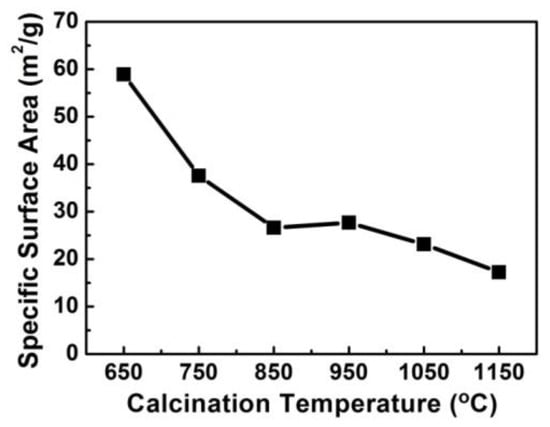 The specific surface areas of Pd/Al2O3 fiber samples were plotted in Figure 8. As the calcination temperature increased from 650 °C to 1150 °C, the surface area decreased from 58.9 m2/g (650 °C) to 17.2 m2/g (1150 °C). This trend of the surface area helps to interpret the catalytic performance of fiber media in the next section.