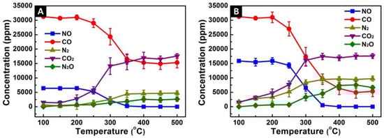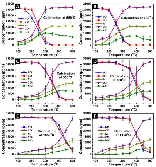 Figure 9A,B show that all the nitrogen oxide and carbon monoxide were decomposed to nitrogen, nitrous oxide, and carbon dioxide gases at a 350 °C reaction temperature for media calcined at 650 °C and 750 °C. These media correspond to the amorphous form of Al2O3 with Pd particle sizes of about 5 nm. Similar results were reported by Chambers et al. when the NO–CO reaction was carried out using the Pt group catalysts []. Granger et al. also indicated that nitrous oxide (N2O) was an intermediated product in a NO–CO reaction [].