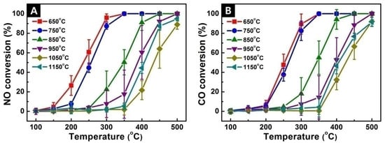 When the calcination temperature was increased to 850 °C and 950 °C, the simultaneous complete conversion of NO and CO was achieved at 450 °C as shown in Figure 9C,D. Interestingly, the XRD results (Figure 6) showed that the alumina crystal structure was γ-Al2O3 nanofibers with average crystallite size D = 9 nm, which were dependent on the calcination temperature. Furthermore, the metallic Pd nanoparticle size (Figure 5) morphologically became larger. Park et al. developed a mathematical model of NO decomposition by CO regarding catalyst particle size [].