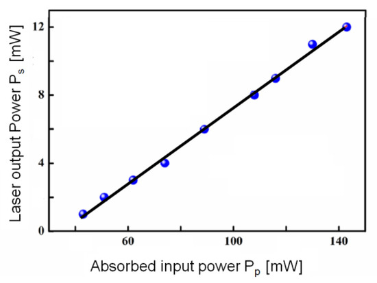 Figure 2 illustrates the laser output power Ps versus the absorbed pump power Pp of the Nd3+/Ho3+ co-doped tungsten tellurite fiber laser of [18]. The maximum output power is Ps = 12 mW and the slope efficiency is η = 11.2%. These values are not very interesting if compared to other lasers, but the power threshold is close to Pth = 38 mW, which is very low with respect to that of Tm3+/Yb3+ doped tellurite fiber lasers with similar pumping scheme and fiber geometry. The aforesaid results indicate that the Nd3+/Ho3+ co-doped tungsten tellurite glass fiber can be considered a promising laser medium candidate for achieving ultra-compact and efficient lasers at wavelengths near λ = 2 μm.