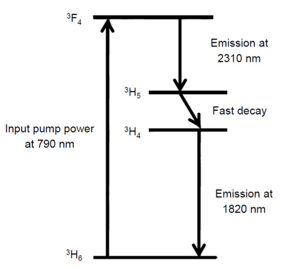 In [21], for the first time, preliminary results on tunable laser emission at wavelengths close to λs1 = 2.31 μm in a Tm3+ doped monomode fluoride fiber laser were reported. The operation scheme included simultaneous laser action at the wavelength λs2 = 1.82 µm. The Tm3+ ions transitions are illustrated in Figure 3. CW laser emission over a Δλ = 250 nm tuning range, extending from λs1 = 2.25 µm to λs1 = 2.5 µm, was experimented. In particular, a Ti: sapphire laser tuned to the wavelength λp = 790 nm (corresponding to the absorption peak of the 3F4 manifold), acting as pump source, and a monomode ZBLANP fiber having length L = 10 m and a refractive index change Δn = 0.007, were employed. The fiber had a linear polarized LP11 mode cutoff at the wavelength λcutoff = 2.06 µm and a low Tm3+ doping level, close to CTm = 500 ppm. The fiber was butt-coupled to a first mirror with reflectivity close to R1 = 99.5% in the wavelength range from λ = 2.3 to λ = 2.7 µm, and transmission coefficient close to T1 = 90% at the pump wavelength. Moreover, a 0.5% output coupler, mirror R2, was employed to complete the optical cavity. At the wavelength of λs1 = 2.31 µm, the threshold pump power for laser oscillation was Pth = 51 mW and the maximum observed output power was approximately Ps = 100 µW.