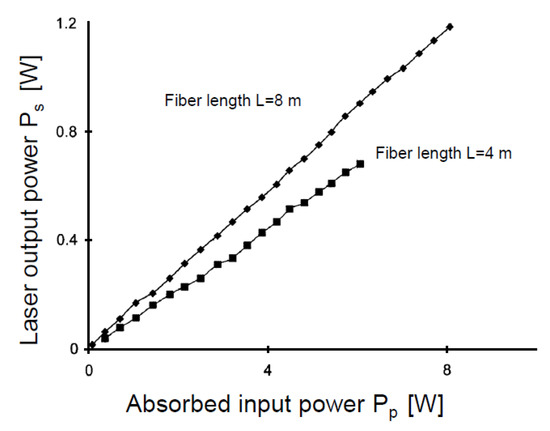 In [22], a power-scalable Er3+-doped ZBLAN fiber laser emitting around λs = 2.7 µm, pumped by a tapered amplifier laser diode with an output power of 1 W at 980 nm, was proposed. The CW output power Ps = 12 mW was demonstrated. A key factor in the achievement of this relatively efficient performance was the use of high Er concentrations, close to 10,000 ppm, in a fiber with length L = 5.5 m. The double-clad fiber had a core diameter Dc = 6 µm, a cladding diameter Dcl = 125 µm and a numerical aperture NA = 0.15. This result was better than those reported in [23] and [24].