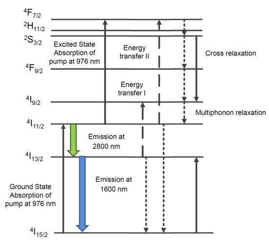 Scheme for the erbium doped fluoride fiber laser based on the cascade of the two transitions 4I11/2 → 4I13/2 at 2.8 μm and 4I13/2 → 4I15/2 at 1.6 μm. Figure adapted from [27].