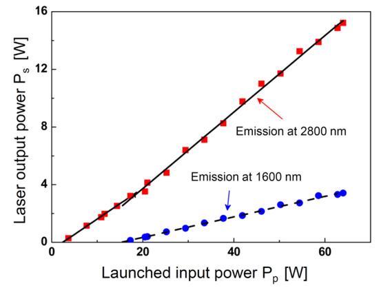 Figure 7 illustrates the characteristics of the fiber laser. The gain fiber was a double-cladding erbium-doped fluoride fiber (FiberLabs., Saitama, Japan) with an octagonal pump core having diameter Dc = 250 μm across the circular cross section, the numerical aperture was NA = 0.5, signal core diameter Dc = 20 μm, numerical aperture NA = 0.2, erbium ions dopant concentration 1.5 mol.%, and fiber length L = 10 m. In particular, (i) the maximum output power Ps1 = 15.2 W with a slope efficiency η1 = 26.7% at the wavelength λs1 = 2.8 μm and (ii) the maximum output power Ps2 = 3.2 W with a slope efficiency η2 = 7.1% at the wavelength λs2 = 1.6 μm were obtained after the laser optimization. In the aforesaid case, no cooling system was employed. In fact, the overall optical conversion efficiency was very high and the thermal load was low.