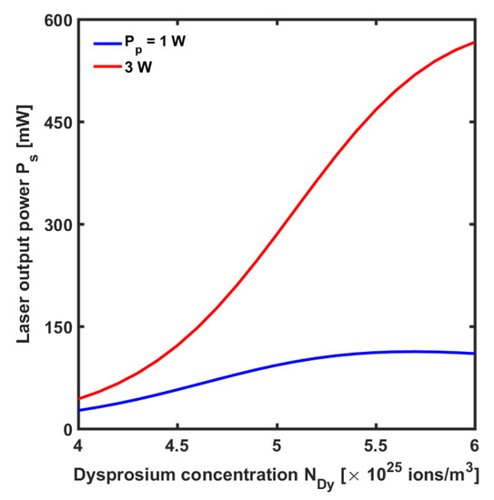 The design is performed by considering the measured PCF. Figure 9 illustrates the simulated CW laser characteristics as a function of the Dy3+ ions concentration. It can be observed that output powers around Ps = 550 mW can be easily obtained with moderately high dopant concentrations, below the glass devitrification limit. An optimized output power Ps = 637 mW and an overall efficiency better than η = 21%, with an input pump power Pp = 3 W, were predicted.