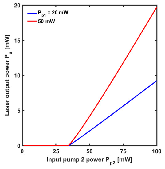 Figure 10 illustrates the simulated characteristics of the fiber laser. By employing an input pump power Pp1 = 50 mW at wavelength λp1 = 2.85 µm, a slope efficiency as high as η = 38% at the signal wavelength λs = 4.38 µm and a lasing threshold as low as Pth2 = 35 mW at the pump wavelength λp2 = 4.1 µm were predicted.