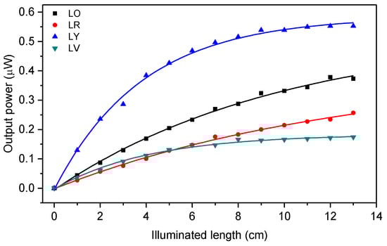 - Illarramendi, M.A.; Zubia, J.; Bazzana, L.; Durana, G.; Aldabaldetreku, G.; Sarasua, J.R. Spectroscopic characterization of plastic optical fibers doped with fluorene oligomers. J. Lightwave Technol. 2009, 27, 3220–3226. [Google Scholar] [CrossRef]