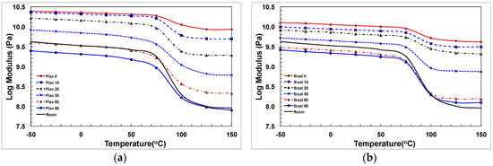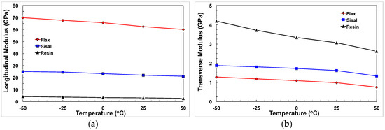 Vf and Vm are the volume fractions of the fibre and the matrix, respectively. It should be noted that the properties of the composites and epoxy matrix change by orders of magnitude in the region of Tg. These large changes can give unexpected results from the micromechanical equations used in this work; and so, we have restricted the temperatures for the micromechanical analysis to the range of −50 °C to +50 °C. The results for the longitudinal fibre moduli of flax and sisal fibres obtained from Equation (1) are compared with the epoxy matrix modulus in Figure 3a. It can be seen that the axial stiffness of both of these fibres is considerably greater than the stiffness of the epoxy matrix; and hence, as observed in the introduction, it can be expected that these fibres will give a considerable reinforcement effect in the composite longitudinal direction. It is further noted that the values obtained for the room temperature fibre moduli of flax and sisal are in good agreement with the values previously reported from single fibre tensile testing.
