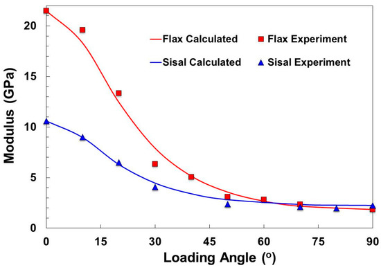 Hence, by measuring the composite modulus as a function of the loading angle, it is possible to obtain a value for GC12 by using the curve fitting Equation (3) with the experimental results taken from Figure 2 at various temperatures. An example is shown in Figure 5 for the flax and sisal composite moduli obtained at 25 °C.
