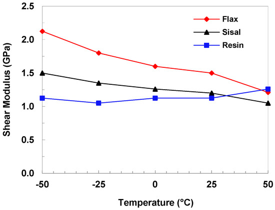 Results for the shear moduli of flax and sisal fibres obtained from Equation (2) are compared with the epoxy matrix shear modulus in Figure 6. It can be seen that the shear modulus of the sisal fibres differs a little from the shear modulus of the epoxy polymer and is actually lower, at lower temperatures. The shear modulus of the flax fibres (1.0 GPa–2.1 GPa) is significantly higher than both the sisal fibres and the epoxy matrix. However, as a reference, it can be noted that the shear modulus of E-glass fibres is more than an order of magnitude greater, at around 30 GPa.