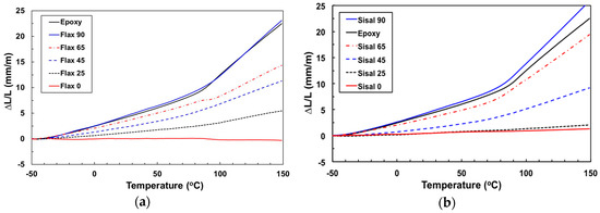 Results of TMA of epoxy matrix composites at various loading angles: (a) Flax fibre composites; (b) Sisal fibre composites.