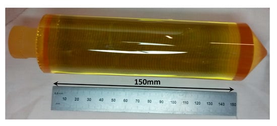 Our tellurite glass was fabricated at Kigre Inc. using 99.999% pure materials and dry atmosphere. The details of related glass preparation are documented in [26]. Three glass rods with ~1.75 in diameter were produced (Figure 1). The base glass consists of ~60 wt % TeO2, ~20 wt % ZnO, and ~20 wt % BaO (see [26] for more details). For the two doped preforms (erbium and lanthanum), ~2 wt % erbium was added to the base glass for testing erbium-doped tellurite fiber lasers (beyond the scope of this work) and ~5 wt % lanthanum was added to depress the refractive index so it can be used as the cladding glass in the fiber. Kigre Inc. (Hilton Head, SC, USA) has made tellurite glass of these large sizes for many years, a testament to the stability of the base tellurite glass.