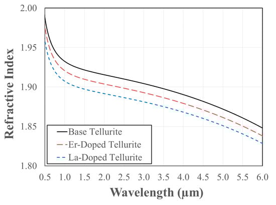 Refractive index curves of bulk tellurite base glass, Er-doped tellurite, and La-doped tellurite measured by ellipsometry.