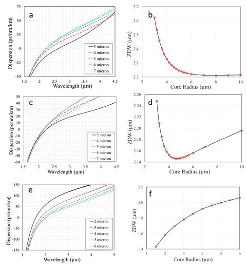 (a) Dispersion curve, of the current design (base tellurite core and Er-doped tellurite cladding), relative to wavelength; (b) zero-dispersion wavelength (ZDW) relative to core radius for the current design; (c) Dispersion curve of the design with base tellurite core and La-doped tellurite cladding, relative to wavelength; (d) ZDW relative to core radius for the La-cladding design; (e) Dispersion curve of the design with base tellurite core and air-clad design, relative to wavelength; (f) ZDW relative to core radius for the air-clad design (all legend refers to radius).