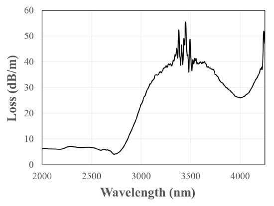 The fiber loss was measured on the Horiba iHR320 imaging spectrometer. The result given in Figure 6 shows a background loss of ~7 dB/m and also a broad absorption band form roughly 2.7 µm–4 µm. This absorption can be attributed to the OH band and is caused by the incorporation of external moisture. The preform was dried at 200 °C with nitrogen gas flows of 5 L/min (five times higher than during fiber drawing) in the furnace on the draw tower. The preform underwent three passes of moving the entire preform through the hot zone. These drying processes did not seem to be sufficient to remove all surface moisture introduced from the atmosphere in the stack.