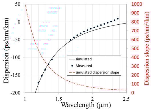 Low coherence interferometry was used for the dispersion measurements [29]. A supercontinuum source with a single-mode delivery fiber from 650 nm to 2.3 µm was used to cover a wide wavelength range. The input beam is split into two arms of the interferometer. The path length of the reference arm can be adjusted to coincide with the designated fiber length. The tellurite fiber was placed at the measurement arm. Beams from the two arms were combined and then passed through a monochromator for wavelength selection. The coherent interference was measured with a liquid nitrogen cooled (InSb) detector. The reference arm path length was initially roughly chosen for the fiber length and was then finely adjusted to determine the exact location for coherent interference by a motorized linear translational stage. This was performed for a range of wavelengths to gather the delay-versus-wavelength data for the tellurite fiber. Due to the erbium-doped nature of the cladding, data collection near 1 µm and between 1.4 µm and 1.6 µm was not possible due to erbium absorption. A polynomial fit was first performed on the delay-versus-wavelength data. The dispersion data can then be obtained from the polynomial fit by taking a simple derivative. The measured dispersion is close to the simulation (see Figure 7). The measured ZDW is ~2.26 µm.