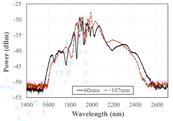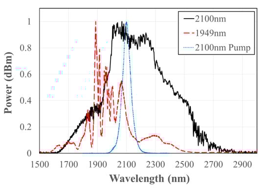 First, the seed oscillator wavelength and the amplifier dispersion of a Thorlabs Tm mode-locked laser (Thorlabs Inc., Newton, NJ, USA) were adjusted in order to determine the optimal conditions that maximize the supercontinuum spectrum in a tellurite fiber sample. The next step was to test for the ideal length of fiber that balanced nonlinear effects and fiber loss. The length decided upon was 60 mm for the tellurite fiber. The pump laser provided a center wavelength of 1.949 µm, a pulse duration of 52 fs, an average power of 570 mW, a repetition rate of 50 MHz and an estimated peak power of 200 kW. Approximately 1000 nm of spectral broadening (Figure 8) was measured. Although the laser’s central wavelength is over 300 nm from the ZDW, we were still able to obtain supercontinuum generation from 1.6 µm to 2.6 µm.