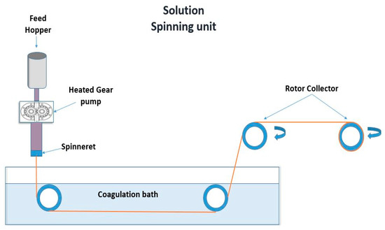 Multi-walled carbon nanotubes (MWCNTs) were dispersed into a binary solvent system of acetone and dimethylacetamide (DMAc) at 70 wt. % and 30 wt. %, respectively, then CA powder was added slowly to the solvent. Using a Sonics VCX130 horn sonicator (Sonics and Materials Inc., Newtown, CT, USA), the MWCNT particles were dispersed for 45 min at 30% amplitude. The beaker was placed in a water bath and an ice pack to avoid the heat. Then, 25 wt. % of CA was added slowly into the CNT dispersed solvents and the solution was stirred by an overhead stirrer for 3–4 h at 40 °C to get a homogenous mixture. The mixture was fed into the hopper and extruded through an extruder attached to a lab scale spinning line as shown in Figure 1. There were three zones (hopper (40 °C), L-shaped channel (35 °C) and extruder (35 °C)) in the spinning line. Filaments were continuously extruded under constant tension and precipitated after contacted with water. The fibers were collected using a take-up roll and then washed with iso-propyl alcohol (IPA) and deionized water (DI) to remove solvents completely, Residual solvents and water content were removed by placing the fibers in a vacuum chamber at 1 Pa pressure and 25 °C for 2 h. All ingredients were procured from Sigma Aldrich Inc. (St. Louis, MO, USA) and Cheaptubes Inc. (Cambridgeport, VT, USA). Afterwards, the single fiber was characterized by SEM, FTIR, and a tensile testing machine.