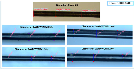 The trapezoidal rule was used to measure the area under the stress-strain curves shown in Figure 4. This area under the curve is the indicator of the fibers’ modulus of toughness. An increase in the modulus of toughness by 25 MPa was observed in 1.5 wt. % MWCNT-reinforced samples. The average modulus of toughness was decreased by 9 MPa for 1.5–2.0 wt. % CNT loaded fibers. The CNT loaded fiber was able to absorb more energy than neat CA fiber. Fracture strain was increased by adding MWCNT to CA fiber.