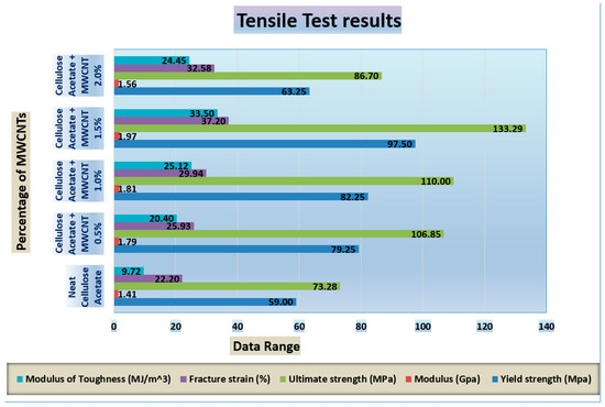 Representative tensile test results bar chart of (a) neat cellulose acetate (CA) (b) 0.5% cellulose acetate-multi-walled carbon nanotube (CA-MWCNT) (c) 1.0% CA-MWCNT (d) 1.5% CA-MWCNT (e) 2.0% CA-MWCNT.