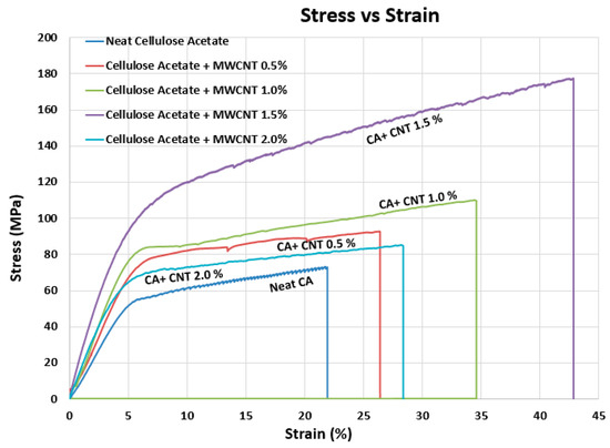 Five categories of materials, namely, neat CA and CA-MWCNT with 0.5%, 1.0%, 1.5%, 2.0% reinforced samples, were tested under tension. The standard deviation was determined and an average value of 4 data sets was taken to get more accurate data. There were 3 or more random samples in each set. The representative stress-strain curves for neat and nanocomposite specimens are shown in Figure 4 and tensile data in tabular form is shown in Table 1. It was observed that the tensile strength was increased by adding a CNT percentage with CA up to 1.5%. Without CNT, the tensile strength was 59 MPa. After adding 0.5% to 1.5 wt. % CNT the tensile strength was 97.50 MPa, but with a further increase of CNT loading of 2 wt. % the strength decreased to 63.25 MPa. The same trend was observed in the modulus, ultimate strength, fracture strain, and toughness.