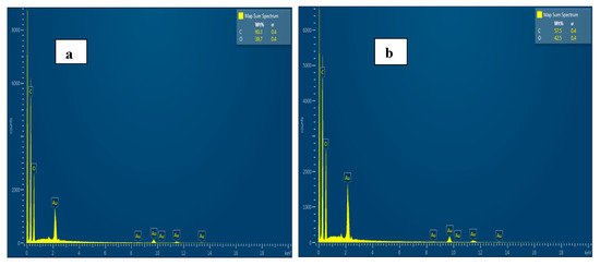 In Figure 6c,d, cross-sectional views of CNT loaded CA fiber show a higher degree of nanofibrillar structure than neat CA. The surface area of cellulose is expanded by interconnected fibrils. For this reason, nanofibrillar cellulose is produced; and also high strength and high modulus is achieved. It was observed from the SEM images that both the fibrillation and the porosity (as shown in Figure 6) were increased with the inclusion of CNT in the fiber. It has been observed previously that the average strength and modulus increases with the increase of porosity from 19% to 40%, and the high toughness of highly porous cellulose nanopapers is related to nanofibrillar network structure [38]. In our previous work [39], less presence of water was detected on CA-CNT samples compared to control samples. As can be observed from the SEM pictures (Figure 6) the enhanced interconnected nanofibrillation in the CNT-reinforced CA samples resulted in improved mechanical properties. We believe, the nanotubes’ surface energy has incorporated a more favorable site for matrix polymer nucleation and fibrillation. In Figure 7, the energy-dispersive X-ray spectroscopy (EDS) study showed that neat CA fiber has 57.5 wt. % of C, and after the addition of MWCNT the percentage increased to 60.3%. The carbon molecule count was increased from 5400 to 6200 on the cross section of the fiber. The percentage of O was decreased about 3% but the oxygen count was unchanged (3000), which indicated the inclusion of CNT into the polymer matrix.