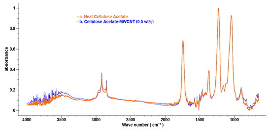 The absorption peaks in the IR spectrum of 1743, 1368 and 1238 cm−1 correspond to C=O ester stretching group, C–H group and C-O group, respectively. The FTIR spectra in Figure 8 shows no significant shift of wavenumber for the inclusion of MWCNT in the CA matrix, which indicates that the sonication process of CNT-loaded solution did not degrade the CA bonding structure. MWCNTs show the characteristic G (1593 cm−1) and D (1350 cm−1) in Figure 8.