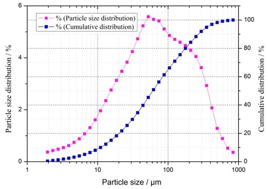 The source material used in this experiment was copper-mine tailings processed through flotation. The samples were collected from Yangla copper industry, Yunnan, China. The chemical composition of the copper-mine tailings is reported in Table 1. Silica and alumina with a substantial amount of iron and calcium can be seen. The particle size and cumulative distribution were analyzed by LSPSDA (Mastersizer 2000, Malverng, Malvern, UK), as shown in Figure 1. It can be seen that the particles with a diameter of less than 100 μm account for 60% of the mine tailings. Morphological characteristics tested by SEM (NOVA400, FEI, Hillsboro, FL, America) were presented in Figure 2. Results showed that copper-mine tailings were unevenly distributed with irregular shapes; large particles have smooth and angular surfaces, and small particles are adsorbed on to the surface of the large particles. XRD analysis was performed with a D/max-RB diffractometer using CuKa radiation (40 kV and 100 mA), at 4°/min ranging from 10° to 70°. The main crystalline materials in the copper mine tailings were quartz (SiO2), albite (NaAlSi3O8), Chlorite (Mg, Al)6(SiAl)4O10(OH)8 and dolomite (CaMg(CO3)2) (Figure 3). Fourier transform infra-red (FITR) spectroscopy analysis was performed by a FTIR system (Nicolet5DXC, Thermo Nicolet Corporation, Madison, WI, America) in the range of 400–4000 cm−1.