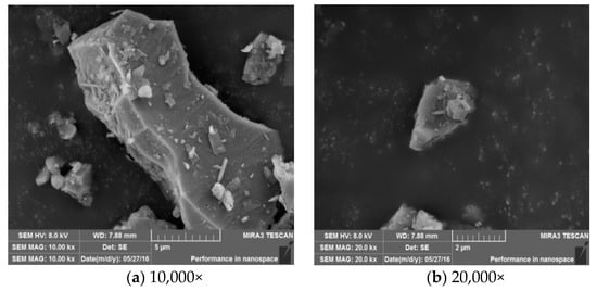 The SEM images of the copper-mine tailings activated at 600 °C for 120 min are shown in Figure 12. It is observed that the particles are irregular in shape and most show a relatively loose and porous surface structure. The thermal activation results in a change in the copper-mine tailings’ crystal structures, which can be observed by their fuzzy appearance of edges and corners. In addition, it softens the crystalline structure, which causes better leaching of Si and Al from copper-mine tailings.