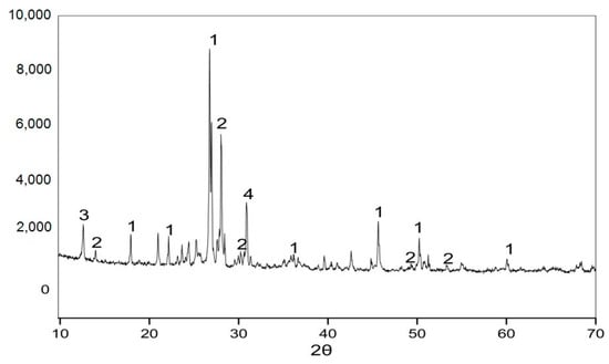 X-ray diffraction (XRD) pattern of raw copper-mine tailings’ powder (1 quartz, 2 albite, 3 chlorite, 4 dolomite).