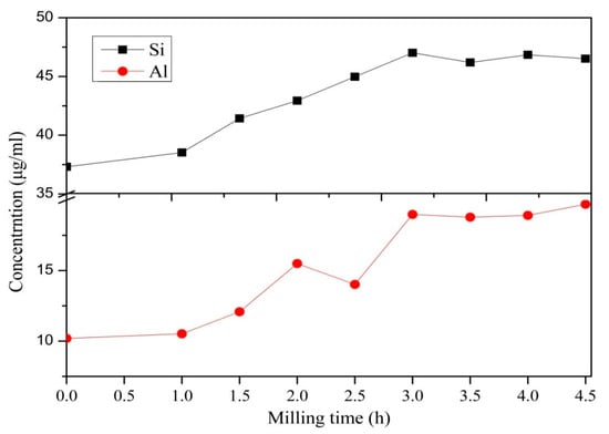 Si and Al concentrations from leaching experiments are given in Figure 4. It can be seen that the maximum leaching concentration of Si is 47.02 μg/mL (M3) and Al is 18.98 μg/mL (M4.5) after mechanical grinding. A significant increase in the leaching concentrations of Si and Al was obtained compared to the raw copper-mine tailings and the values were 26.03% and 93.33%, respectively. This phenomenon was also consistent with previous results reported by Wang et al. [27].