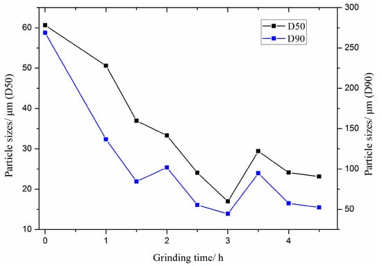 Figure 5 shows the cumulative particle size distribution of milled copper-mine tailings against time. The curves slowly shift to the left side with the increase in grinding time. In contrast, after 3 h, curves begin to shift to the right side. This illustrates that the particle size of copper-mine tailings was gradually decreased with the increase in grinding time up to 3 h and then increased. Moreover, the particles of the M3 sample of less than 10 μm in size increased by 20% compared to the original sample (increasing by as much as 31.45%). Meanwhile, particles of less than 44.00 μm in size increased by as much as 89.63%. Particle sizes D50 and D90 at different grinding times for the copper-mine tailings are illustrated in Figure 6. It can be seen that particle sizes D50 and D90 are rapidly decreased with the increase in grinding time. After 3 h of grinding, the particle sizes D50 and D90 reach their minimum sizes of 16.98 μm and 44.53 μm, respectively. This indicates that, after 3 h, continuous grinding causes a gradual increase in particle size, which suggests that particles start to bond together. This agrees with the previous results in literature [28]. Therefore, 3 h can be considered as the optimal mechanical grinding time under these conditions.
