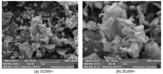 SEM images of activated sample M3 (after 3 h of grinding) (10,000 (a) and 20,000 (b) magnification).