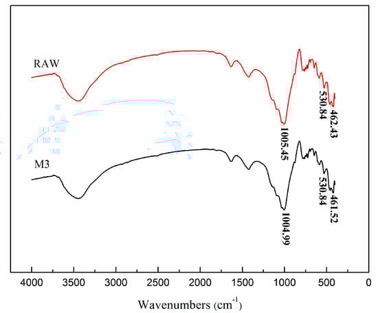 Fourier transform infra-red (FTIR) spectra of raw copper-mine tailings and Sample M3 (after 3 h of grinding).