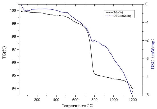 Thermo-gravimetric–differential scanning calorimetry (TG–DSC) curve of raw copper mine tailings (10 °C~1200 °C; atmospheric conditions).