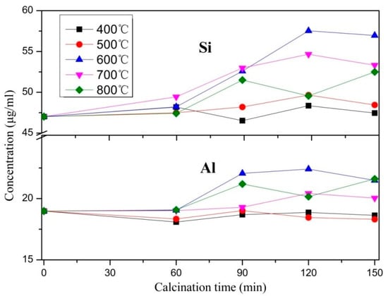The experimental results of thermal activation of copper tailings at different temperatures and time intervals are shown in Figure 11. The highest leaching concentrations of Si (57.53 μg/mL) and Al (22.41 μg/mL) are observed at the activation temperature of 600 °C for 120 min. The leaching concentration of raw copper mine tailings is 20.22 μg/mL for Si and 12.22 μg/mL for Al. The percentage increase of Si and Al at the leaching concentration is 54.19% and 119.92%, respectively, after activation. These results are in line with the study of Ahmari et al. [29]. During the thermal-activation process, water evaporation causes the disintegration of the crystal structure and then it repolymerizes, which increases the cementitious activity of Si and Al, and ultimately improves the cementitious activity index of copper-mine tailings. The general mechanism of alumino–silicate cementitious materials is proceeded as (a) dissolution of source material (copper-mine tailings) in the presence of alkaline solution; (b) rearrangement of dissolved ions; (c) hardening of gel-like products (formed due to hydration, i.e., N-A-S-H or C-A-S-H gel) after certain curing conditions (e.g., curing temperature, time, alkali concentration, and water/solid ratio) [30,31].