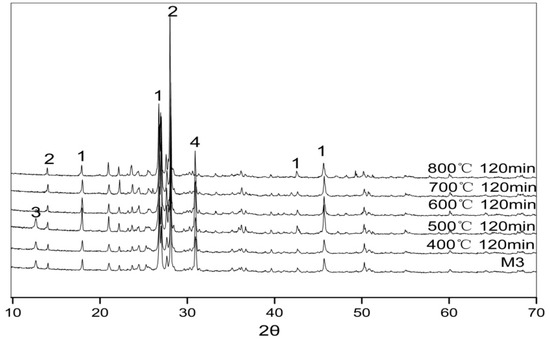 XRD patterns of the thermally activated conditions of copper tailings (1 quartz, 2 albite, 3 chlorite, 4 dolomite).