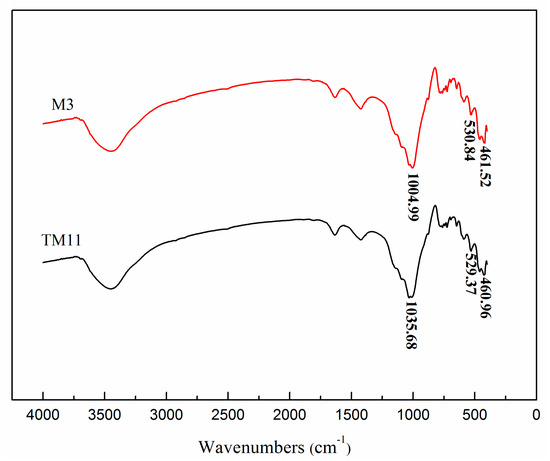 Figure 13 shows the XRD patterns of copper-mine tailings activated for 120 min at various temperatures. It can be seen that crystalline chlorite dissolved at 600 °C. This is most likely due to the fact that chlorite crystals are broken down with the increase of temperature. It can be seen from Figure 14 that the Si(AlIV)-O-Si asymmetric stretching band of 1004.99 cm−1 has disappeared. The Si-O bend vibrations reduced from 530.84 cm−1 and 461.52 cm−1 to 529.37 cm−1 and 460.96 cm−1, respectively. This indicates that the extent of polymerization of [SiO4]4− and [AlO6]9− ions is reduced by mechanical grinding. Meanwhile, the Si-O and Si(AlIV)-O-Si bonds of copper-mine tailings are broken during thermal activation, which results in a better cementitious activity index of raw copper-mine tailings.