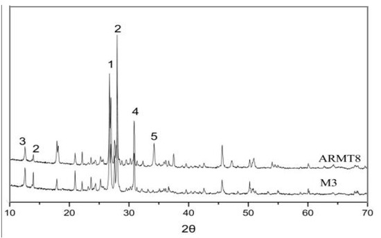 XRD result of raw copper-mine tailings and sample M3 (after 3 h of grinding) (1 quartz, 2 albite, 3 chlorite, 4 dolomite).