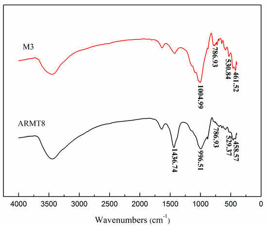 XRD patterns of alkaline roasting-activated copper mine tailings are shown in Figure 15. Crystalline silica and albite exhibit less intensive peaks after activation which indicates that some crystalline silica and albite have been disintegrated, and biotite has been generated; a similar phenomenon has been observed by Ahmari et al. [32]. It can be seen from Figure 16 that the Si(AlIV)-O-Si asymmetric stretching band 1033.65 cm−1 has disappeared, and 1004.99 cm−1 is reduced to 996.51 cm−1. The Si–O bond vibration is reduced from 530.84 cm−1 to 529.37 cm−1 and 461.52 cm−1 to 458.57 cm−1. Wave number 786.93 cm−1 represents the [AlO4] bond vibration and its intensity decreased in alkaline-roasting activation. The O–C–O asymmetric stretching band is observed at 1436.74 cm−1; this may be due to the intensive reaction of NaOH with CO2 in the presence of air during roasting activation.