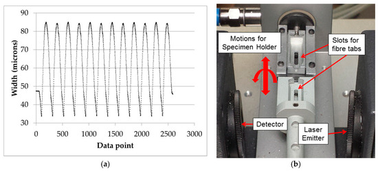 The CIC used a combined diameter and tensile measurement system. Tabs were used at either end of the gauge length and fibers were mounted to the tabs using a high viscosity, UV curing, acrylated urethane (Dymax 3193) as the fixative. The diameter was measured using a laser scanner LSM6000-500s (Mitutoyo, Kanagawa, Japan) which is attached to a FDAS760 specimen holder (Dia-Stron Limited, Andover, UK). A portion of the laser beam is interrupted by the fiber and based on the measurement of the shadow cast, a detector interprets the size of the fiber. The fiber is rotated 360° around its axis to capture numerous 2D measurements. Figure 2a shows a sample measurement of the fiber diameter by the rotational laser scanner. In Figure 2a the minimum fiber diameter was approximately 35 µm and the maximum fiber diameter was approximately 85 µm. Figure 2b shows the overall set-up of the laser scanner.