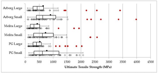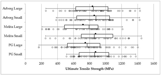 Comparing the mean values from Table 2 and the quartile information from Figure 3 and Figure 4, the trend can be seen within the results from each facility that the large stem samples have a lower tensile strength performance in comparison to their small stem counterparts. For NDSU, the large stem materials saw a reduction in tensile strength of 28% to 41%, which is a substantial reduction in performance for a reinforcement material in a composite application.
