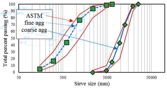 In this research, Type I 42.5 Portland cement (with a specific gravity of 3.15 g/cm3 and specific surface of 3.19 m2/g) conforming to the requirements of ASTM C150 [] was used. The supplementary material included silica fume (with a specific gravity of 2.2 g/cm3 and specific surface of 21.2 m2/g) conforming to the requirements of ASTM C1240 []. Chemical compositions of the cementitious materials are given in Table 1. The aggregates were composed of naturally crushed coarse aggregates, with a specific gravity of 2.67 g/cm3 and 19 mm nominal maximum size, and washed natural sand with a specific gravity of 2.61 g/cm3. Figure 2 shows the grain size of the aggregates consumed. In this research, five different types of fibers were used: polypropylene, steel, glass, basalt, and polyolefin with a 0.1% volume of concrete mixture. Table 2 shows the characteristics of the fibers.