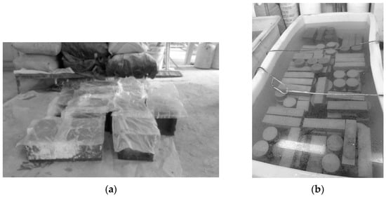 Concrete mixes were cast into molds after workability testing, and they were then coated with a polyolefin cover to prevent the initial moisture vapor. After 24 h, the concrete samples were demolded and cured in a water tank at normal temperature until testing day (Figure 3).