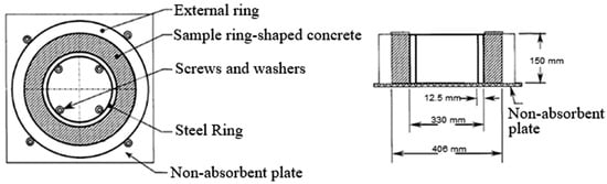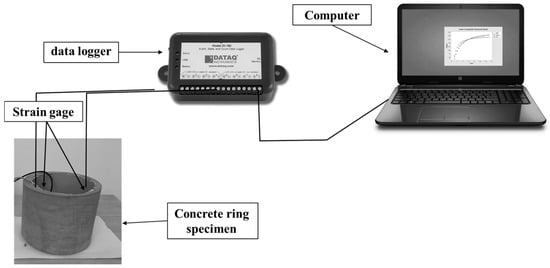 The restrained shrinkage test was performed according to ASTM C 1581 []. Accordingly, concrete specimens were made in the form of a ring with a height of 150 mm, an inner diameter of 33 mm and an outer diameter of 40.6 mm (Figure 5). In Figure 5, details of the concrete ring specimen are shown. Concrete rings were placed on a waterproof plate (made of polyolefin). After 24 h, outer steel rings were demolded and the upper part of the concrete rings were covered with paraffin wax to prevent moisture evaporation. To measure the steel ring strain, two strain gauges were installed in the middle of the steel ring height in opposite directions. A data logger was used to continuously record the data. The process of measuring the shrinkage of concrete rings is shown in Figure 6. The shrinkage of concrete rings was measured right after demolding. Due to the high dependence of shrinkage to the environmental factors such as the temperature and humidity in the early ages, concrete rings were kept in a room with a constant temperature of 22 °C and a humidity of 60%, which were constantly monitored in environmental conditions.