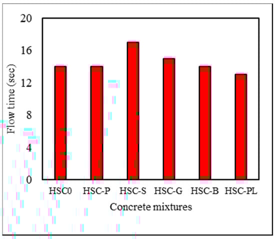 The way fibers are added to concrete mixture affects its balling or clumping. In order to reduce these effects, fibers were mixed with aggregate before adding water, so that after splitting cubic specimens with an age of 1 day, and fibers were favorably dispersed in the cementitious matrix volume. Flow times of each mixture are given in Figure 7. The addition of fibers had no considerable effect on flow time. In mixtures containing steel fibers, flow time showed minimal rise-up. The target slump was 25 mm, which correlates to a flow time of 15 s.