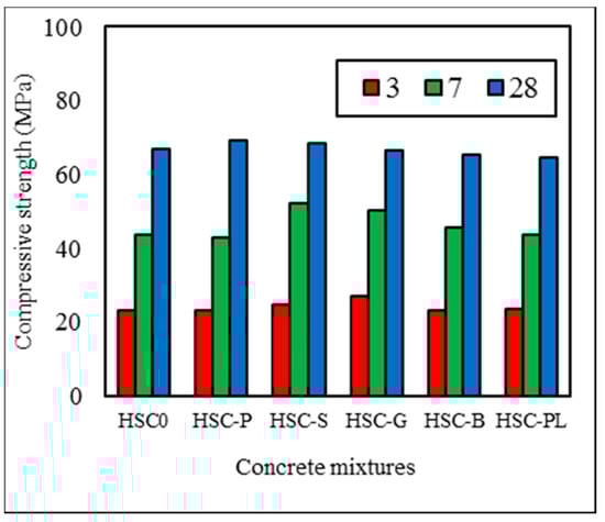 Compressive stress testing was performed at 3, 7, and 28 days, and the results are given in Figure 8. It was observed that the compressive strength of the fibrous concrete at early ages increased up to 16% (HSC-G, 3 days) and 20% (HSC, 7 days) respectively, compared to control concrete, which increased up to 3% by 28 days. This shows the positive effect of fibers at early ages. Despite the need for high-strength acquisition at early ages in the above-mentioned cases, using fibers was positively efficient. At 7 days, the strength of all mixtures (except for HSC-P) was higher than that of the control concrete. It seems that the matrix–fiber interface bond quality was weak, which led to a drop in strength. At 28 days, the polyolefin-fiber-containing mixture dropped in strength. After cubic specimen failure, it was observed that the balling effect in some portions blocked a smooth stress distribution and an optimal stabilization.