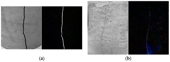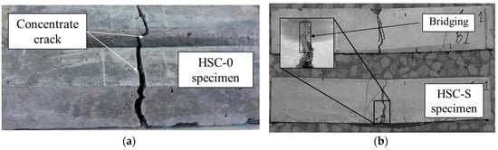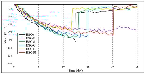 It can be seen that, after demolding, cracks generated on the concrete ring surface developed to full-depth cracks by 28 days; however, in polypropylene-fiber-containing mixtures (HSC-P), no signs of full-depth cracks were observed (Figure 12). This result shows that crack width was reinforced for this mixture.