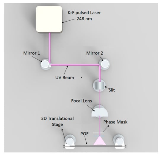 Figure 1 presents the experimental setup employed on the POFBG inscription, where a KrF Bragg StarTM Industrial-LN excimer laser operating at 248 nm with a pulse duration of 15 ns is employed, which presents a beam profile of a rectangular Tophat function with dimensions of 6.0 × 1.5 mm2 and divergence of 2 × 1 mrad2. The setup also presents mirrors, focal lens, and a slit with a 4.5 mm width for positioning the UV beam on the phase mask employed, which is focused onto the fiber core through a plano-convex cylindrical lens (Newport CSX200AR.10, Newport, Irvine, CA, USA) with an effective focal length of 200 mm. The setup presented results in an effective spot size on the fiber with a width of 20 mm and a height of 32.4 µm. In addition, 3D translational stages are applied in order to obtain the correct positioning of the fiber. Also, the translational stages avoid fiber bending during the inscription.
